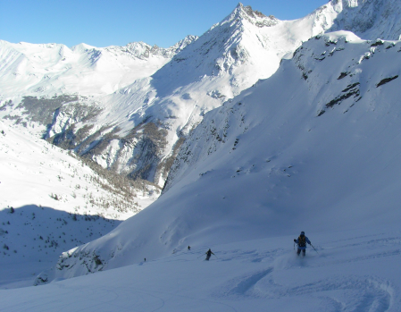 In south-west Switzerland this is a great area for you to learn about ski-touring. Basically, it’s the area that includes the ski resort of Verbier. The extended valley stretches southwards from the town of Martigny all the way up to the Italian border. Here there is a good variety of great tours in the hills sandwiched between the Mont Blanc Massif and the Grand Combin. Fine journeys, good skiing and amazing views of these fine mountains. Some tours have lift access to help start the day while others just start from the road end.